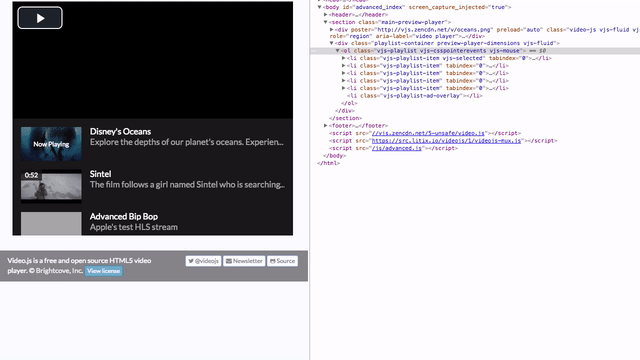 For this example, We’re using the videojs-playlist-ui and videojs-playlist plugins for the playlist functionality. We then wrap the player in a container and put the playlist-ui element in there as well.